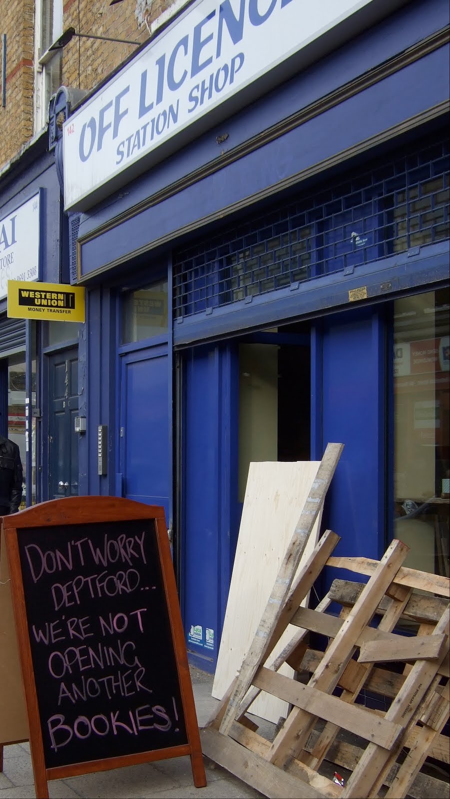 The 'Off Licence Station Shop' at 142 Deptford High Street, just south of the train station, had its facade and new sign installed last year some time, but its promise of mobile top-ups, travel cards and groceries was yet to materialise.
